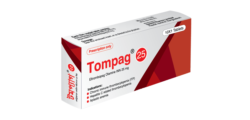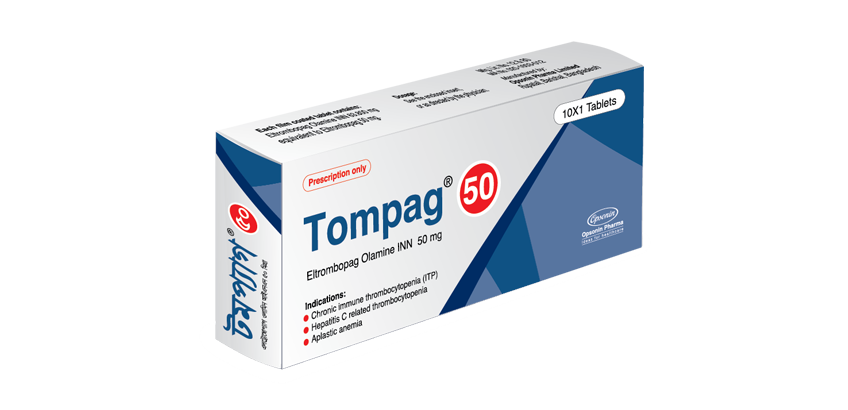 Tompag® tablet contains Eltrombopag Olamine as active ingredient. It is an antithrombin agent.